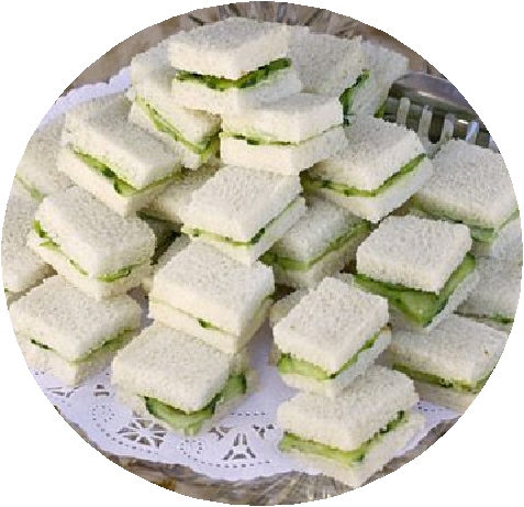 Asparagus fingers are quite the rage. Cut the crusts off your pieces of white bread, pop your asparagus in the middle and wrap around. Make sure you put butter on the bread first. Otherwise it will be dry and crusty. This you do not want. Present them beautifully on a platter garnished with fresh green lettuce leaves. Next you must have your cucumber sandwhiches on a nice plate right next door to the fingers.
