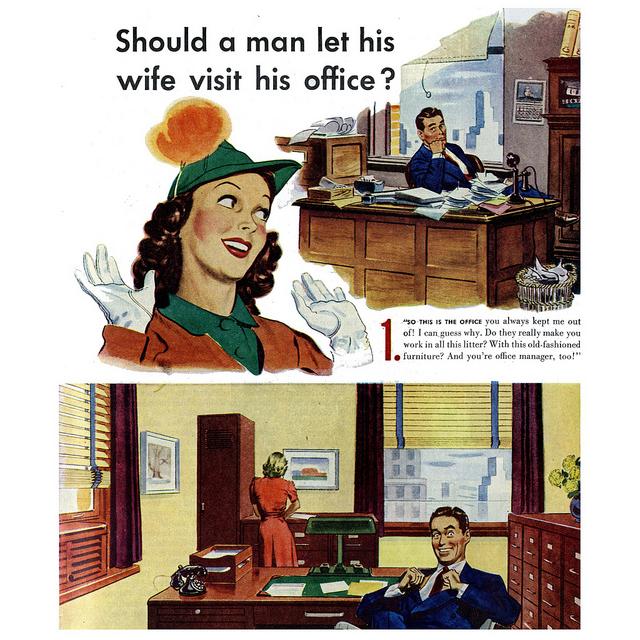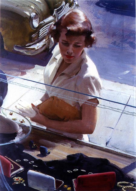 Next she visits him at the office and checks up on his dealings with the ‘secretary’. Once she is convinced all is on the up and up …. for the time being. She’s off to shop for supplies. Hmmm what would he like for dinner? She decides to stock the fridge with choice. A gorgeous new Kelvinator fridge, of course.