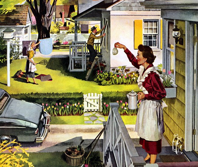 What is the definition of a 1950s C.E.O. wife? To support her important hubby of course. First she waves goodbye as he drives off in his lovely silver grey ford fiat.